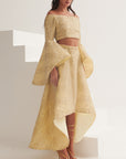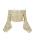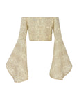 This embroidered yellow organza cropped top has a fitted silhouette and long bell sleeves complementing its off-shoulder neckline.